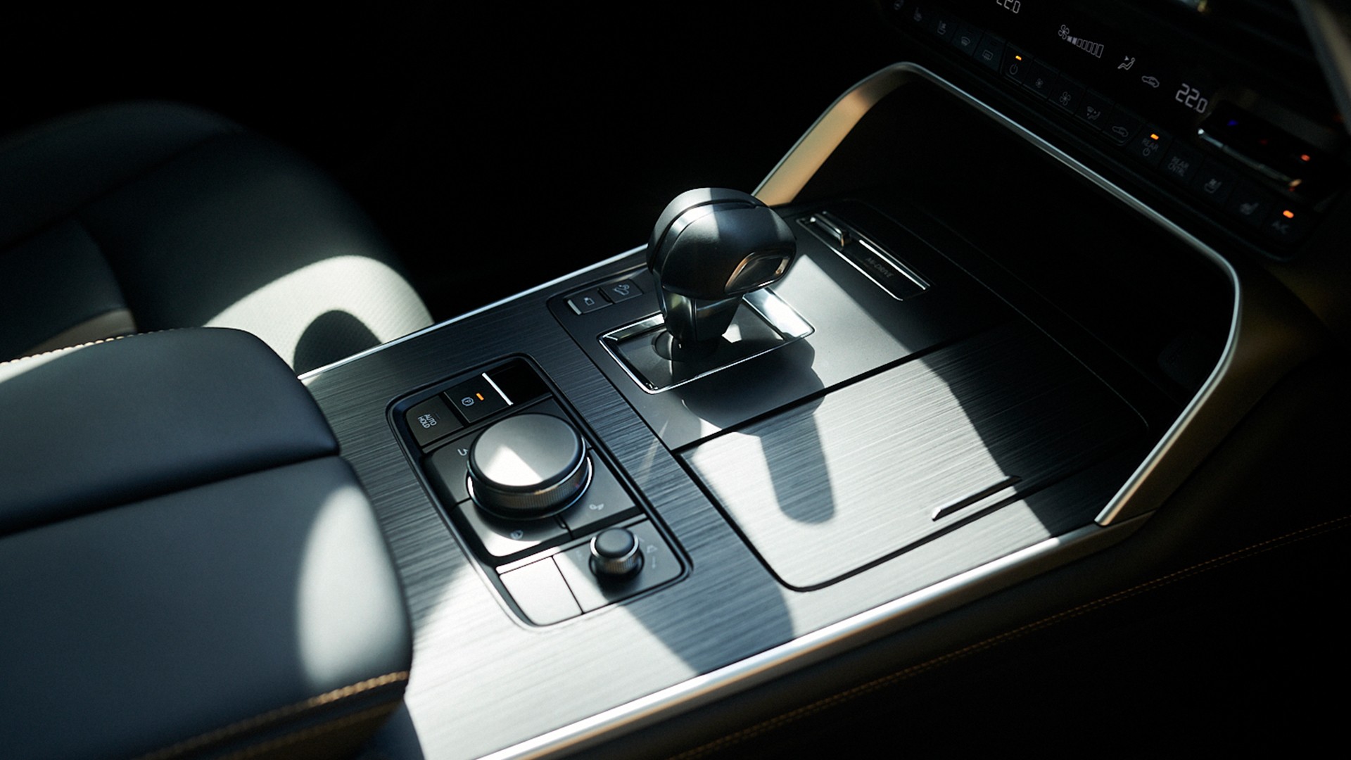 En arrivant en ville, les arrêts incessants de la circulation urbaine me poussent à basculer le CX‑80 en mode VÉ. D’une simple pression sur un bouton, le groupe motopropulseur hybride rechargeable du VUS passe en mode tout électrique pour réduire les émissions.